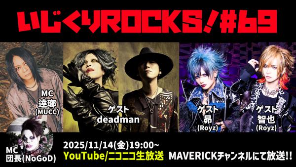 MUCCの逹瑯とNoGoDの団長がMCを務めるMAVERICK DC GROUP公式番組「音楽情報ライヴ いじくりROCKS!」69回目の放送が、2025年11月14日(金)19時より配信される。