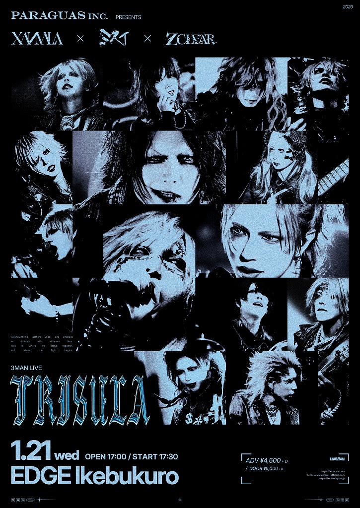 意外にも、レーベルが主催した形での全バンドの共演は、こと"PARAGUAS inc."ではこれまで行ってこなかった。各バンドが年間スケジュールを綿密に作って動いてきたことで、たまたまその機会がなかったのが理由でもあった。だからこそでもないが、3バンドの共演するイベントが決まったのは嬉しい驚きでもあった。しかも池袋EDGEという、あえてヴィジュアル系らしい箱での共演だ。XANVALAも、ミスイも、広島をベースに活動を続けてきたZ CLEAR!も、自分たちが飛躍していくうえで大切にしてきた場所の一つが池袋EDGEだ。ここをワンマン公演でしっかり埋めきったうえで、次のステージへと階段を上がっていく。もしや、今回のイベントPARAGUAS inc. PRESENTS 3MAN LIVE「TRISULA」公演を池袋EDGEで行うことにも、先を見据えての思いがあるのだろうか...。